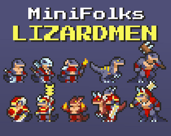 The MiniFolks - Lizardmen pack contains 11 pixel art characters, with and without outline.